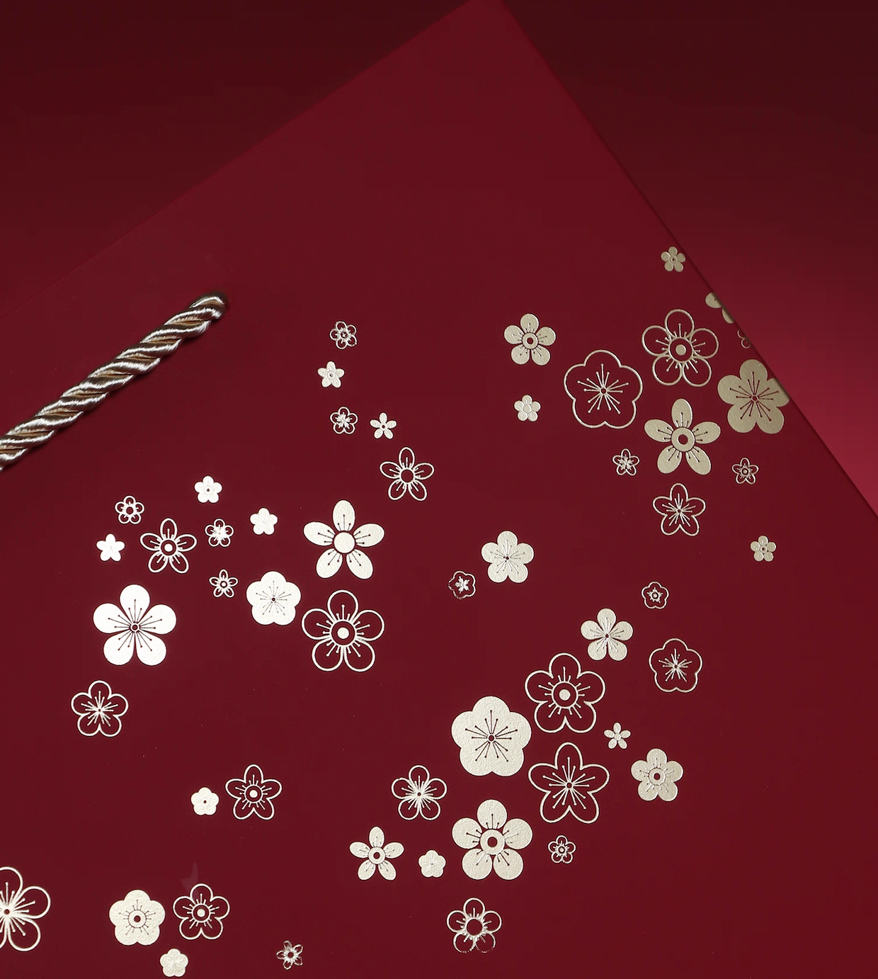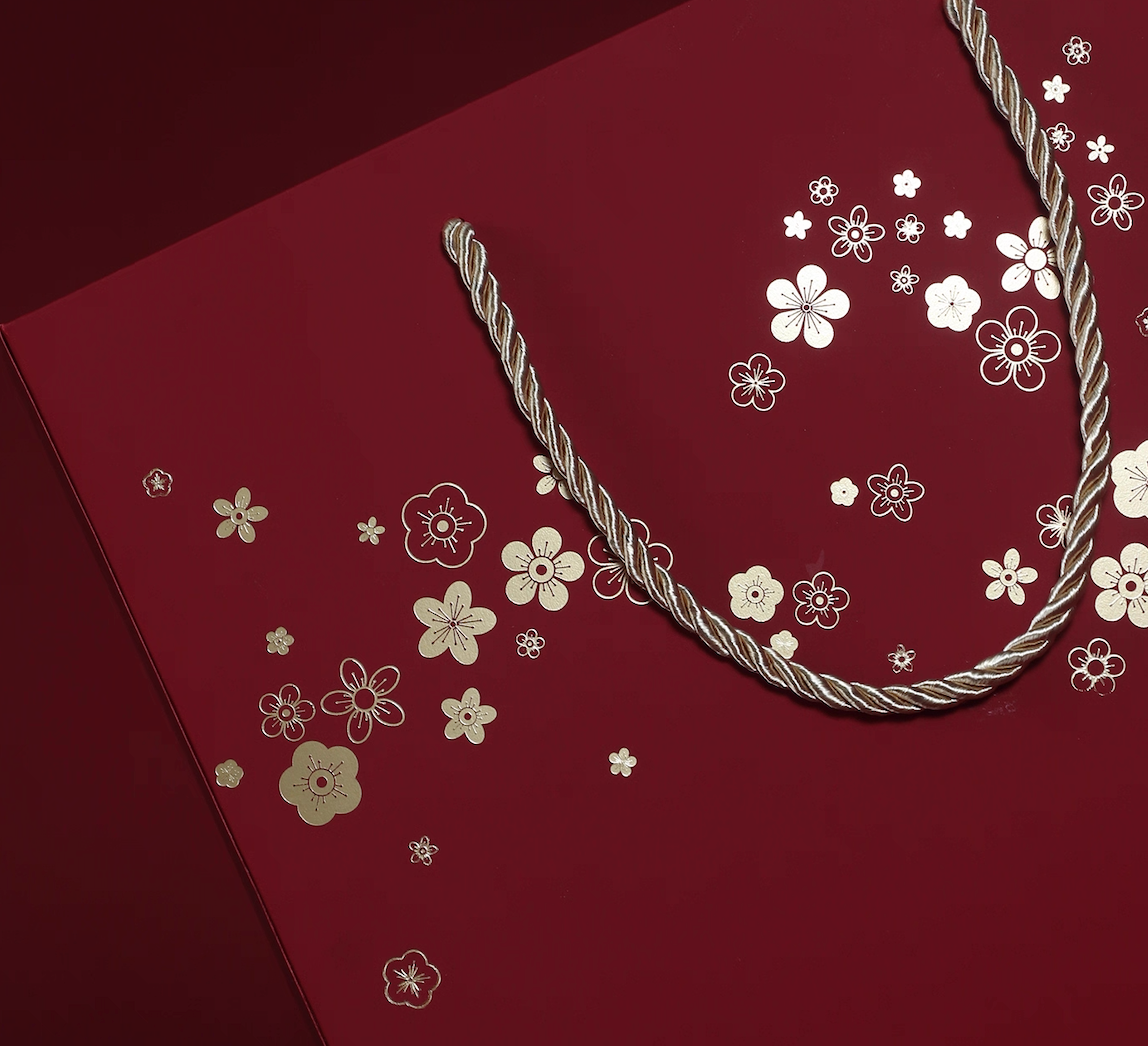 High-end Chinese-style gift tote bag, used for gift packaging, gold-plated plum blossom pattern, presenting metallic luster, the hand-held rope adopts hemp braided rope shape, retro three-dimensional, and the hand-held rope has tassel hanging beads, which highlights the Chinese style.
